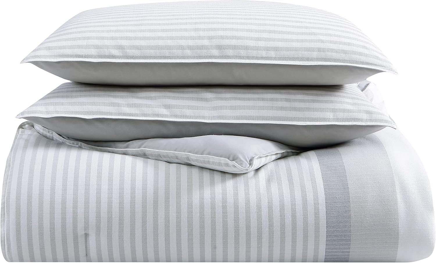Cool and crisp, this engineered stripe was inspired by traditional fouta textiles used in many Mediterranean countries for everything from towels to bedspreads. Nautica updated interpretation for bedding is clean, classic and comfortable in an all-cotton, heavy weight herringbone weave. The yarn-dyed stripes are a soft, medium weight Blue and white with an accent of gray at the bed break. Standard shams Echo the thinner stripes at the base of the bed and European shams are color blocked with grey herringbone weave and Blue chambray side borders. Accent pillows mix the stripe and solid fabrics enhanced with piecing, taping and stitched details. Coordinate with our Nautica sheets and blankets.